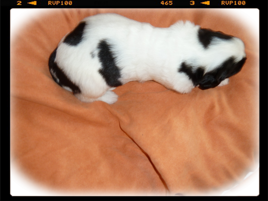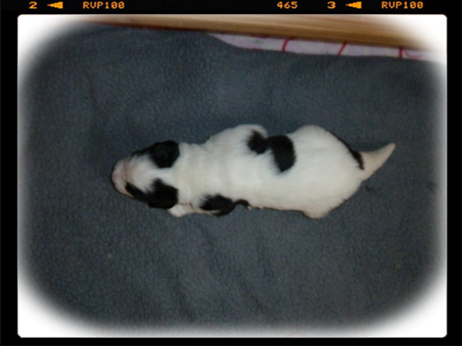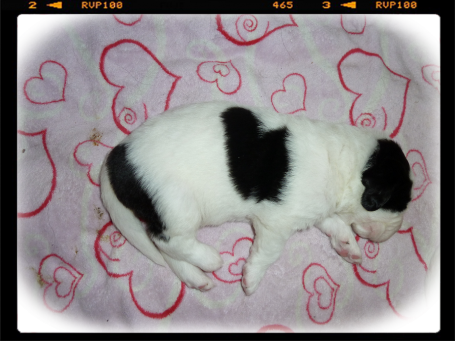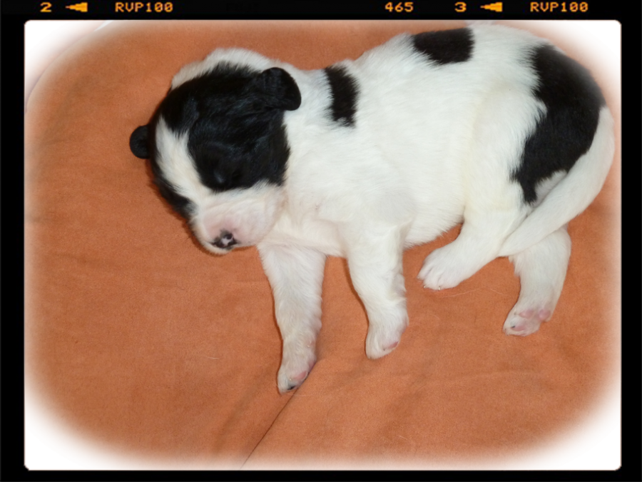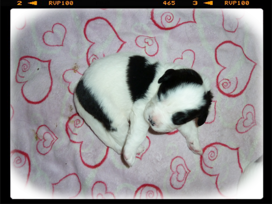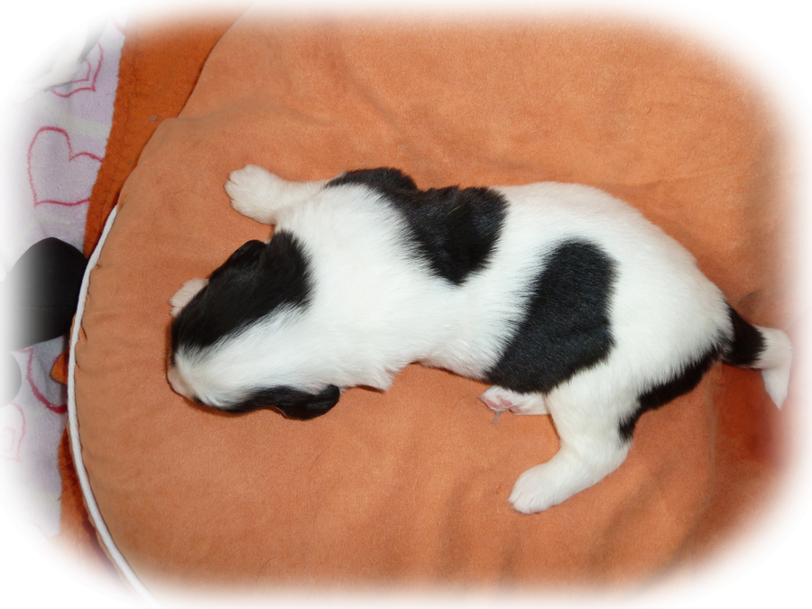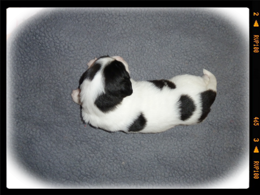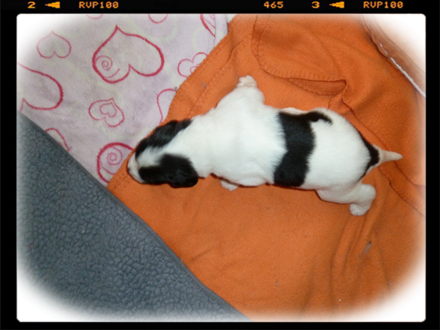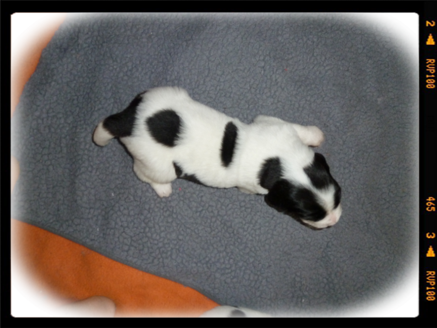 Unser 5. Welpe eine schön gezeichnete Hündin. Der Welpe kam um 03:40 Uhr zur Welt und er wog 630 Gramm.