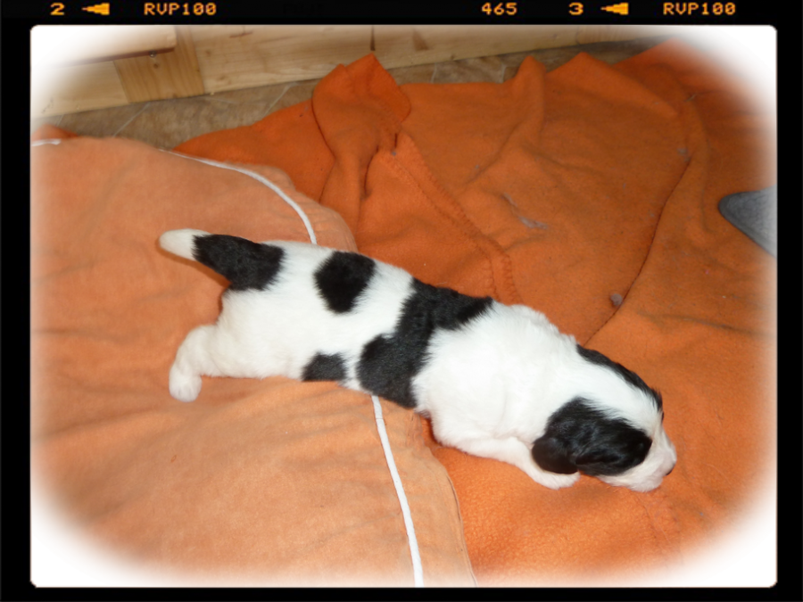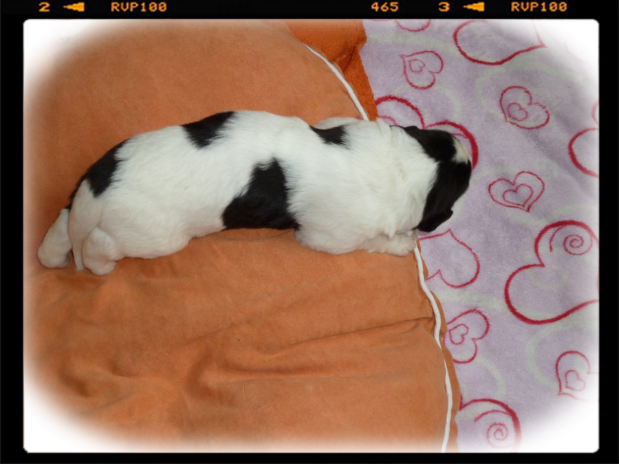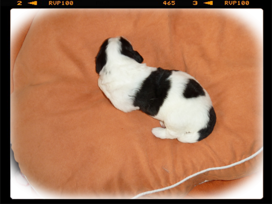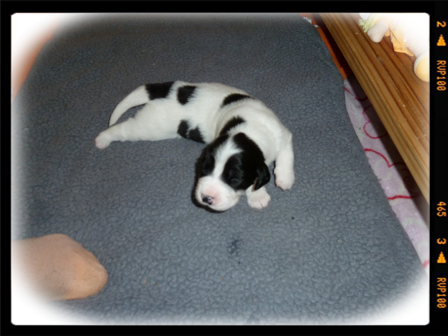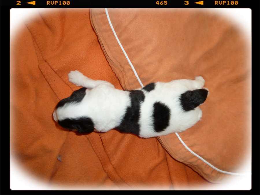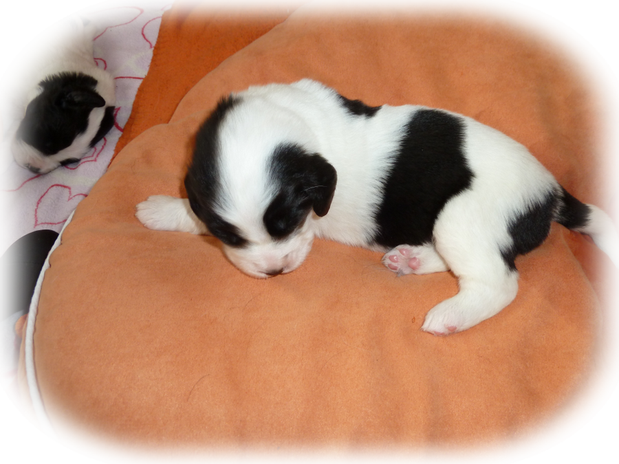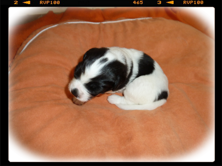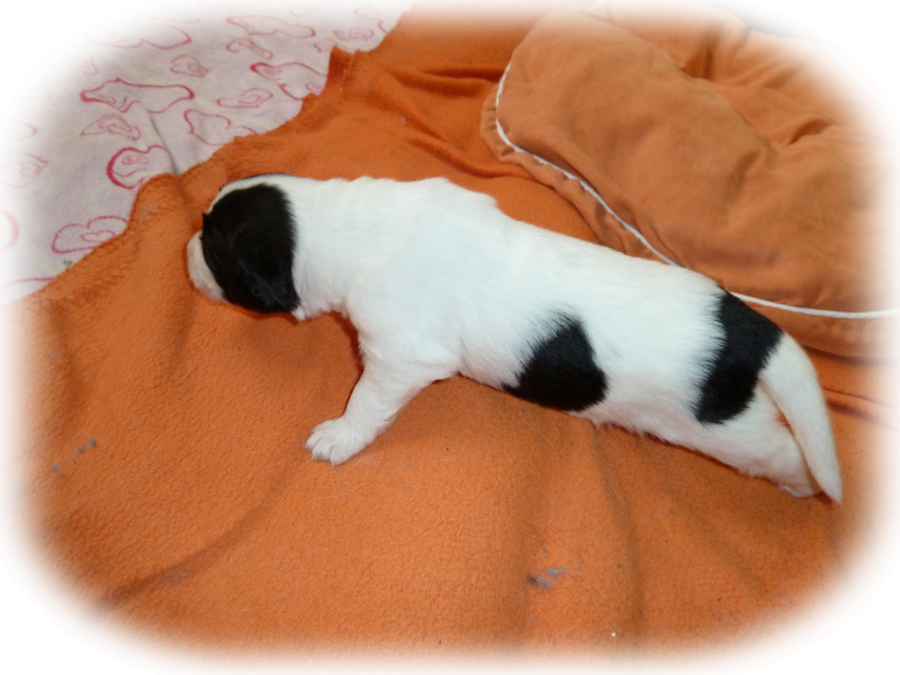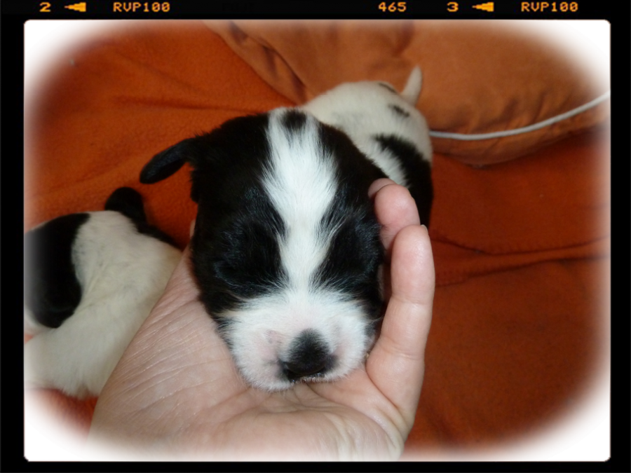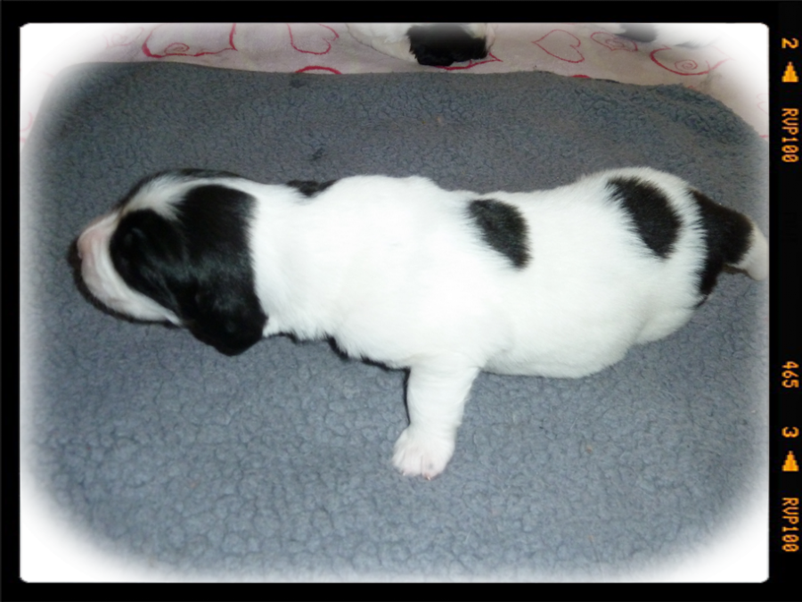Unser 5. Welpe eine schön gezeichnete Hündin. Der Welpe kam um 03:40 Uhr zur Welt und er wog 630 Gramm.