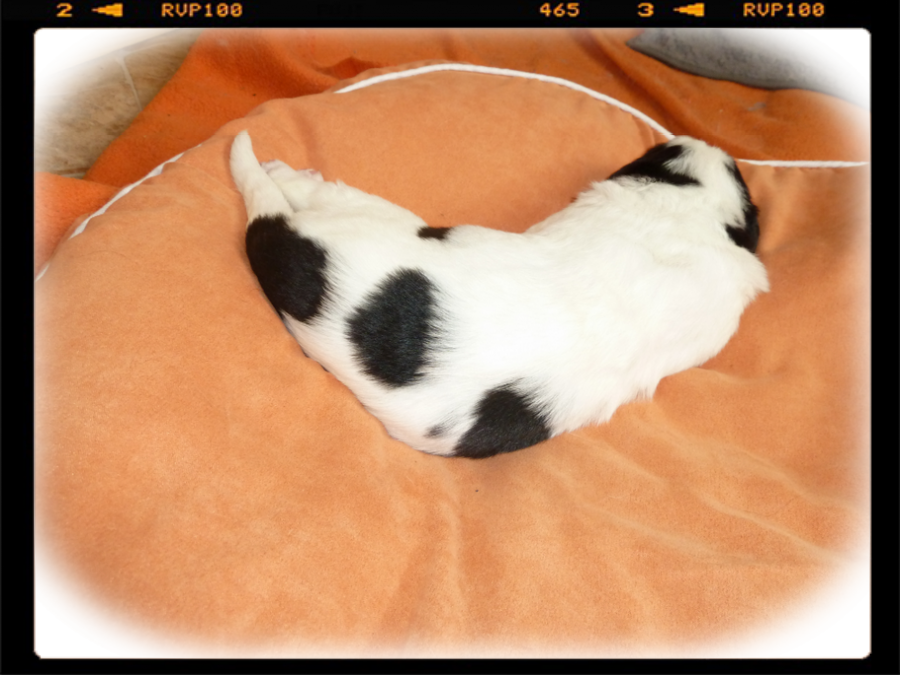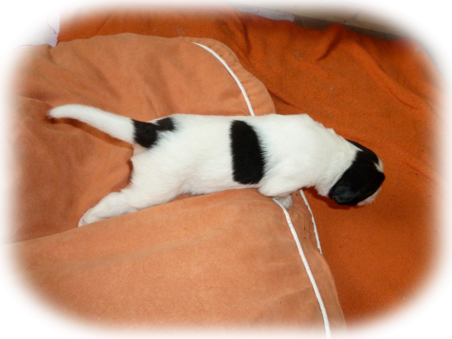 Unser 4. Welpe eine schöne Hündin mit wenig Schwarz. Der Welpe kam um 01:41 Uhr zur Welt und er wog 400 Gramm.